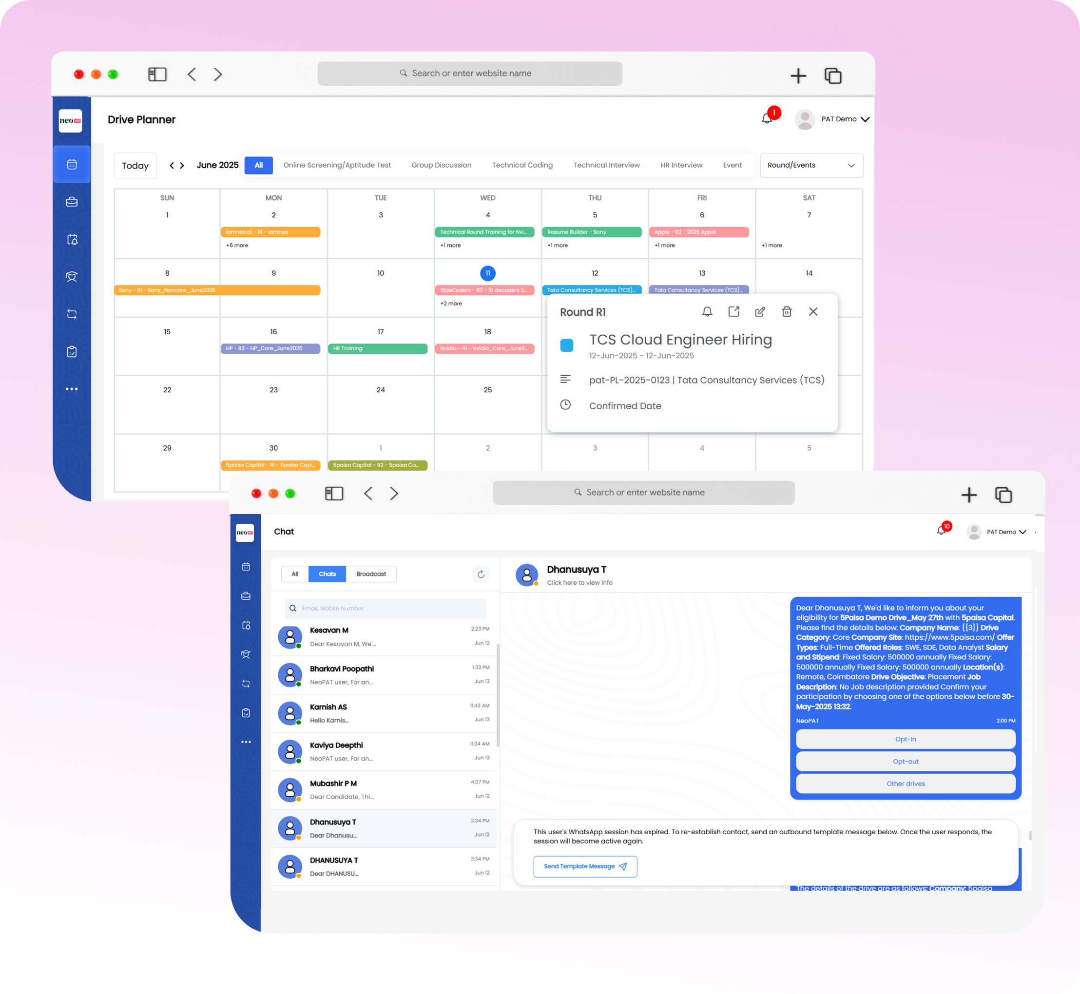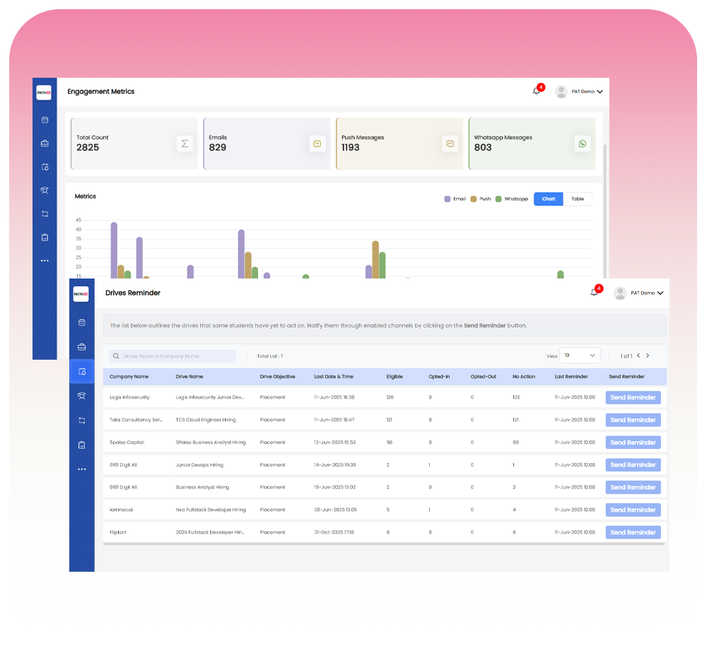 Use automated WhatsApp notifications and smart reminders to keep students and companies updated throughout the entire placement cycle.