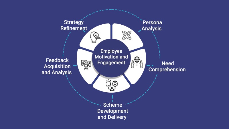 The Constructivist Learning Theory developed by psychologists like Piaget and Vygotsky, believes in active learners. This approach emphasizes to design a course based around the learners’ experience and meet their specific needs. Hence, we are keeping the employees at the center and trying to frame a strategy to achieve motivation and engagement among them. We enrolled a convenience sample of 800 employees, conducted a survey and based on their responses designed a framework called “The Wheel of Engagement“.